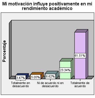 En la figura 6 se muestra que la mayoría de los estudiantes (61.5%) consideran que la motivación influye positivamente en el rendimiento académico, los cuales coinciden con los resultados en relación a la motivación en el ámbito educativo encontrados por Naranjo (2009).Existen tres aspectos relevantes para la motivación que deben tomarse en cuenta en el ámbito educativo: las expectativas de la población estudiantil, el valor otorgado a las metas educativas y las consecuencias afectivo-emocionales resultantes del éxito o del fracaso académico (Naranjo Pereira, 2009).