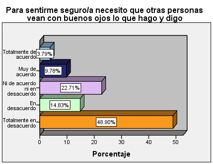 En la figura 7 en lo que respecta a la autoconfianza y relaciones interpersonales de los estudiantes del estudio el 48.9% y el 14.8% consideran estar totalmente en desacuerdo y en desacuerdo respectivamente en que para sentirse seguro/a necesitan que otras personas vean con buenos ojos lo que hacen y dicen, sin obviar que un 3.7% y un 9.7% se encuentran totalmente de acuerdo y de acuerdo, lo que indica que existe un 14% de la población estudiantil con necesidad de fortalecer aspectos de seguridad en sí mismos, relacionado con la autoestima.