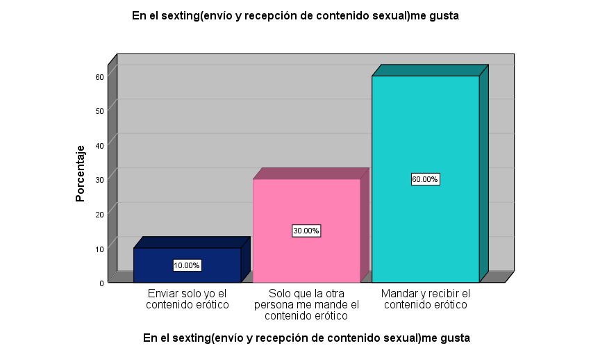 En esta tabla se refleja que a los jóvenes les gusta mandar y recibir el contenido erótico (60%), el (30%) prefiere solo que la otra persona les mande el contenido erótico, y el (10%) prefieren mandar solo ellos el contenido.