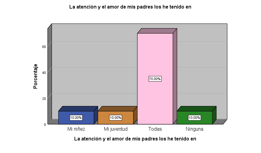 En el grafico No. 4 se observa que un (70%) de los jóvenes ha tenido siempre la atención de sus padres, un (10%) solamente durante su niñez, (10%) en su juventud, y el otro (10%) nunca.