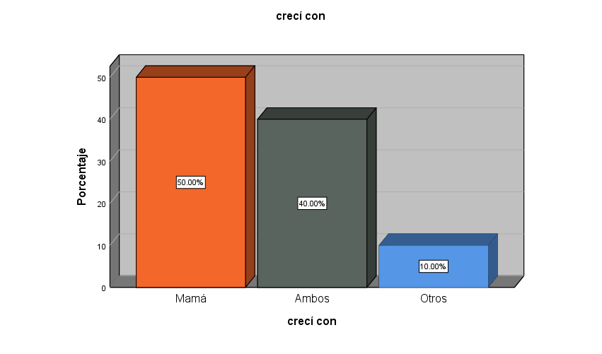 El (50%) de los encuestados solo crecieron con mamá, un (40%) con ambos (Papá y Mamá), y un (10%) otros (abuelos). Ver gráfico No.5.