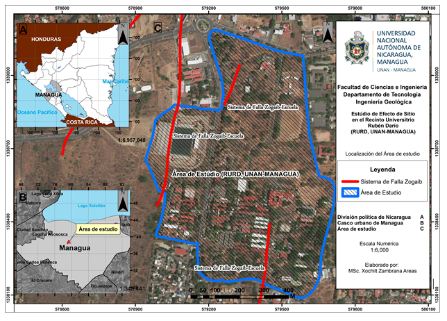 El área de estudio es un punto de referencia en Managua porque es la universidad de más concurrencia de estudiantes, y se encuentra en continuo crecimiento. Al oeste de la universidad, se localiza una zona falla geológica conocida con el nombre de Falla Zogaib. La falla geológica conocida como “Zogaib”, se extiende desde el costado oeste de la calle 39 al sureste de la pista de la UNAN hasta las inmediaciones del Recinto Universitario “Rubén Darío”, por lo cual representa una amenaza sísmica para la zona de estudio (Figura 1).