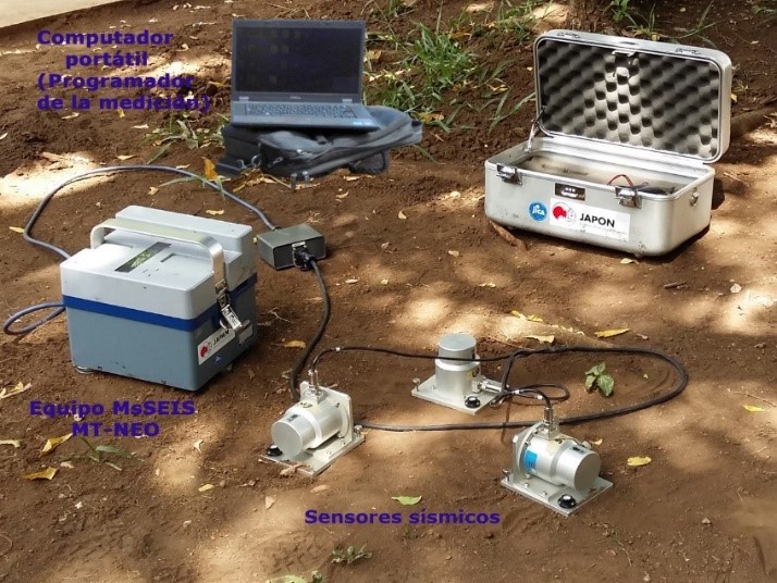 El equipo de medición utilizado en el trabajo de campo fue el equipo McSEIS-MT NEO, es un acelerómetro digital que contiene tres sensores externos para la medición de vibraciones en el suelo. Adicionalmente, se le integra un sistema de posicionamiento global (GPS) y funciona de forma automática con una batería interna para su operación en el campo. El instrumento no requiere de una fuente sísmica artificial (como el golpe de un martillo o detonación de explosivos) para la adquisición de vibraciones ambientales en el subsuelo que son producidas por las actividades humanas, el tránsito vehicular, el ruido de maquinarias o fenómenos naturales como el viento, mareas de los océanos y las variaciones en la presión atmosférica.