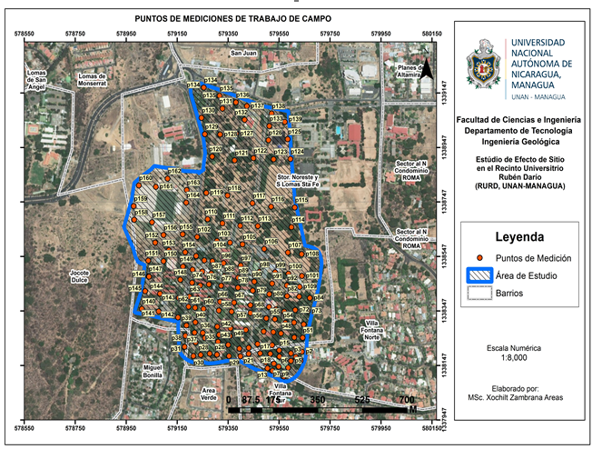 Un total de 164 registros de mediciones en el campo fueron adquiridos con el acelerómetro McSEIS-MT, con una separación de 50 metros entre cada estación de medición, las cuales fueron distribuidas en todo el área del Recinto Universitario Rubén Darío de la UNAN-Managua como se observa en la Figura 5.