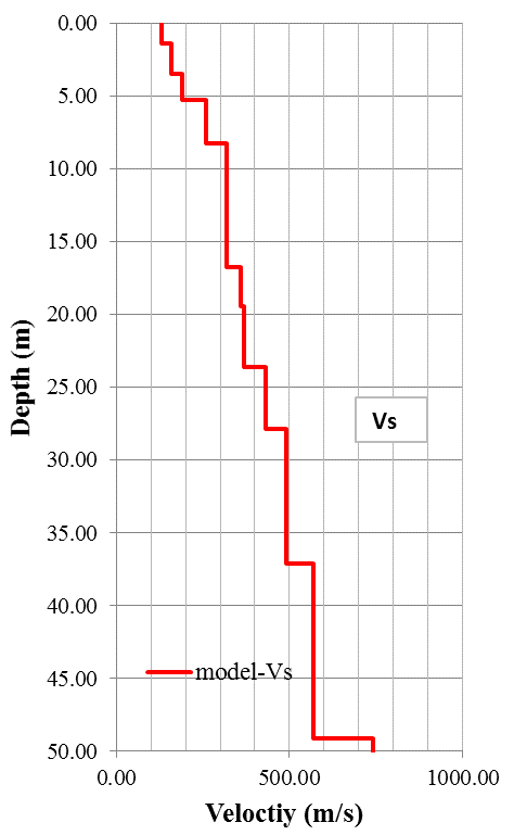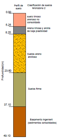 | Profundidad (m) | H (m) | Vs (m/s) | Tipos de suelos |