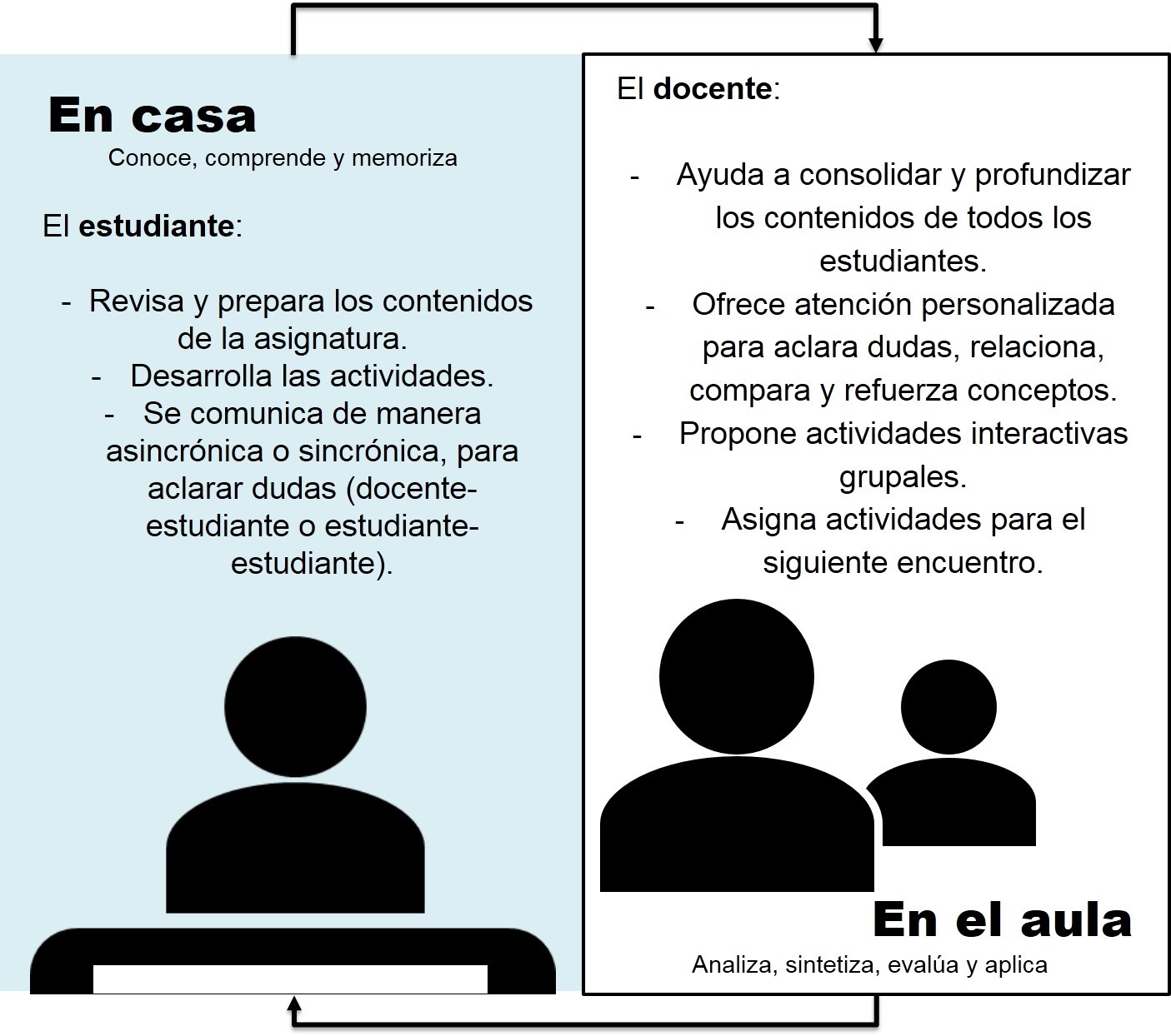 Para Bergmann y Sams (2012), el aula invertida es un modelo andragógico que consiste en invertir los dos momentos que intervienen en la educación tradicional, es decir, modificar el orden metodológico tradicional, quedando las tareas en el aula de clase y los contenidos temáticos son aprendidos en casa, por ende surge un cambio en la forma de hacer llegar los contenidos a los estudiantes para que aprendan a su ritmo (Fig. 1). Sin embargo, el proceso inicia desde casa cuando los estudiantes hacen uso de la tecnología de la información y comunicación (TIC) y del internet, para acceder a los recursos de los contenidos cuidadosamente desarrollados por los docentes para revisar, analizar y estudiarlos, permitiéndoles prepararse previo a la clase. La dedicación, motivación y autonomía por parte del estudiante, representan la base del proceso de aprendizaje en este modelo.