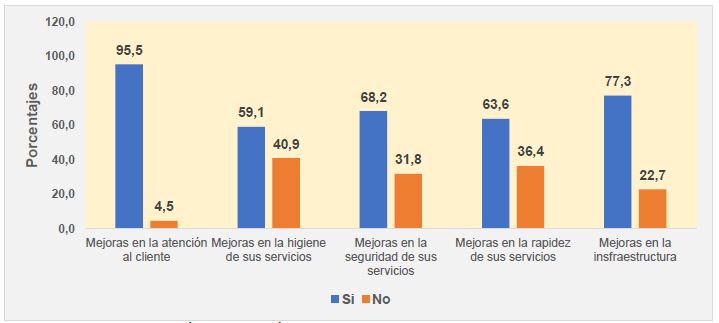 En cuanto a seguridad se refiere, el 68% sostiene que se ha mejorado en este aspecto, por último, con un 63.6% y 59.1%, el personal de la empresa considera que se han implementado innovaciones en la rapidez y la higiene de los servicios respectivamente.
