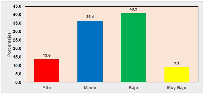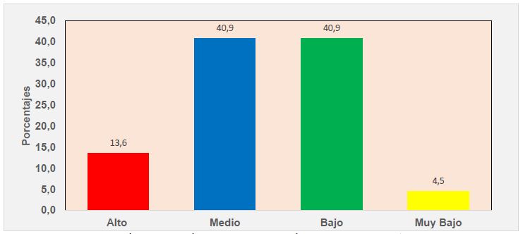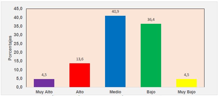 En el gráfico N° 3, se puede observar que el 40.9% y el 13.6% de los colaboradores acreditan un nivel medio y alto respectivamente. En cambio, el 40.9% y el 4.5% opinaron por un nivel Bajo y muy bajo de innovación en cuanto a procesos de soporte se refiere.