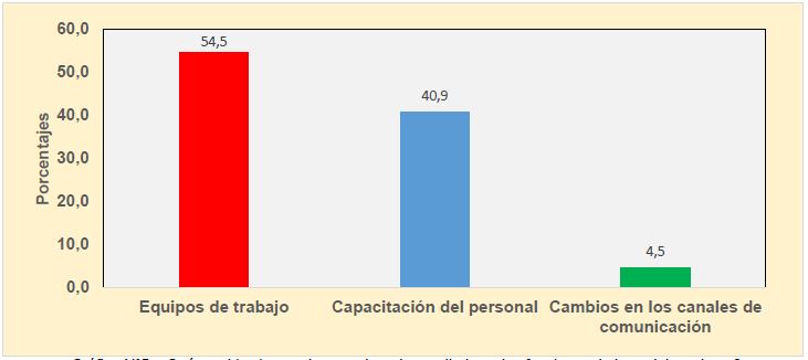 El gráfico Nº5 muestra los resultados obtenidos referentes a los cambios realizados en la empresa, en el cual se observa que con el mayor porcentaje (54.5%) de los encuestados, afirma que se han implementado equipos de trabajo en la entidad. En contraste a lo anterior con el 40.9% y el 4.5%, manifiestan que se desarrollan capacitación al personal y cambios en los canales de comunicación respectivamente.