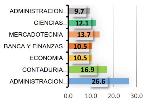 Se puede observar en el gráfico No. 3, que más de 50% de los receptores de remesas se concentra en las carreras de Administración de Empresas (26.6%), Contaduría Pública y Finanzas (16.9%) y Mercadotecnia (13.7%), este fenómeno se explica por la cantidad de estudiante matriculados por carrera están distribuidos en ambos turnos.