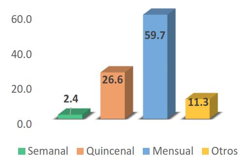 Con respecto a la periodicidad se pudo conocer que los estudiantes en su mayoría un 59.7% reciben remesas mensualmente, un 26.6% de ellos reciben quincenalmente, un 2.4% reciben semanalmente, esto se ve traducido a que existe una alta dependencia hacia las remesas en concepto de ingresos fijos y otros reciben con diferente intervalo de tiempo los cuales representan un 11.3%.
