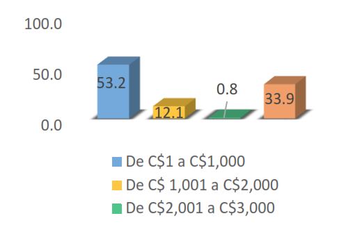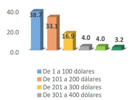 Según los datos obtenidos, un 38.7% de los estudiantes reciben en promedio de 1 a 100 dólares mensuales, un 33.1% recibe de 101 a 200 dólares, un 16.9% recibe de 201 a 300 dólares, un 4% recibe de 301 a 400 dólares, un 4% de 401 a 500 dólares y una pequeña representación del 3.2% recibe mensualmente de 500 dólares a más.
