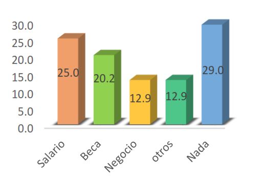 Los resultados de la encuesta realizada indican que el 25% de los estudiantes receptores tiene ingresos extras por salario, por otro lado, un 20% expresó recibir beca, el 12% tiene ingresos por negocio propio, en cambio el 29% restante no cuenta con otra fuente de ingreso además de las remesas.