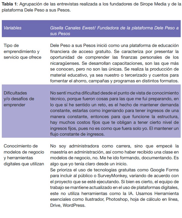 A continuación, se presenta la entrevista realizada a la fundadora de la plataforma Dele Peso a sus Pesos, Gisella Canales Ewest. El instrumento aplicado constó de 16 preguntas semiestructuradas, de las cuales se sustraen cinco variables como: tipo de emprendimiento y servicio que ofrece, dificultades o desafíos de emprender, conocimiento de modelo de negocio y herramientas digitales que utilizan para emprender, así como el rol de la educación superior y el compromiso que debe asumir el estudiante que desee emprender desde su profesión. Para esta entrevista se tomó como criterio de inclusión ser graduados de la carrera de Comunicación Social o Periodismo y tener un emprendimiento digital activo.