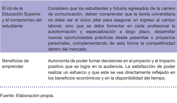 Con esta investigación se desataca el interés que tienen los estudiantes de comunicación por emprender de forma digital desde su disciplina, siendo una oportunidad factible a corto plazo y a su vez, como una alternativa laboral viable y sólida.