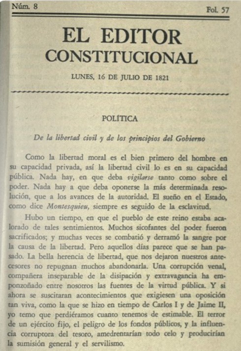 Para comprender mejor la posición de El Editor Constitucional, hay que advertir que su fundador era un hombre de clase media, preocupado por la precaria situación de la capitanía general. los sucesos de España y los movimientos emancipadores del resto del continente americano lo mantenían alerta, informado de ahí su vinculación con monárquicos y republicanos (p. 7).