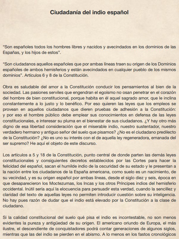 Ahora bien, en El Editor Constitucional del 14 de agosto de 1820 se publica un artículo titulado: “Ciudadanía del indio español” firmado bajo el seudónimo de J. M. de la P. en el que se exponen las razones por las cuales el indio debe ser considerado ciudadano en pie de igualdad. El autor trae a colación argumentos basados en las leyes emanadas del espíritu constitucional gaditano, abogando para que el indio sea aceptado en puestos administrativos. Por otra parte, se cuestionan las protectorías y la tutoría hacia los indios.
