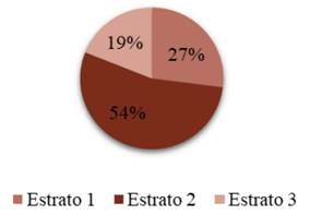 La distribución de los beneficiarios del programa "Jóvenes a la U" en UNIMINUTO según su estrato socioeconómico revela un patrón que merece un análisis profundo. Los datos muestran que el 54% (344 estudiantes) pertenece al estrato 2, el 27% (171 estudiantes) al estrato 1, y el 19% (118 estudiantes) al estrato 3, evidenciando una clara focalización hacia poblaciones de menores ingresos (ver Figura 3).