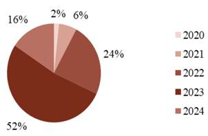 La distribución temporal de los beneficiarios del programa "Jóvenes a la U" en UNIMINUTO revela una clara evolución y expansión progresiva del programa. Los datos presentados en la Figura 4 muestran una tendencia creciente desde su implementación, con un punto máximo en 2023, distribuido así: 2020 (2%, 11 estudiantes), 2021 (6%, 39 estudiantes), 2022 (24%, 152 estudiantes), 2023 (52%, 332 estudiantes) y 2024 (16%, 99 estudiantes).