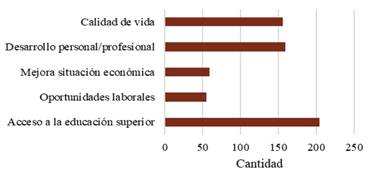 Los aportes específicos del programa “Jóvenes a la U” revelan un impacto multidimensional en la vida de sus beneficiarios. Los resultados presentados en la Figura 7 muestran que el principal aporte identificado es el acceso a la educación superior con 204 respuestas, seguido del desarrollo personal/profesional con 159 menciones y la mejora en la calidad de vida con 156 respuestas. En menor medida, pero igualmente significativas, se encuentran las mejoras en la situación económica (59 respuestas) y las oportunidades laborales (55 respuestas).