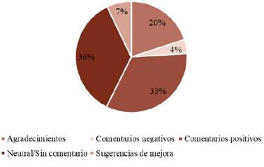 Una vez recolectados los datos, se procedió a su tabulación utilizando Microsoft Excel. Se realizó un análisis de frecuencias para todas las respuestas, calculando las medidas de tendencia central y distribución de frecuencias correspondientes. Las respuestas de las preguntas abiertas fueron categorizadas temáticamente (por ejemplo: "Agradecimiento", "Comentarios positivos", "Sugerencias de mejora", “Problemas de logística”, etc.) y posteriormente cuantificadas mediante el conteo de frecuencias para su inclusión en el análisis estadístico descriptivo.