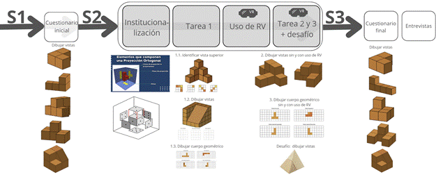 La propuesta se centró en la introducción de proyecciones ortogonales mediante el uso de RV, evidenciando los cambios en los tipos de respuestas de los estudiantes desde cuestionarios pre y post implementación. Las actividades requirieron que los estudiantes generaran vistas de figuras geométricas y dibujaran cuerpos geométricos a partir de vistas. Se planteó una organización de tres sesiones (Figura 2) con las etapas de recolección de datos e implementación.