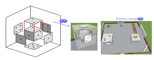 Al iniciar la segunda sesión, se mostró la Figura 4 (lado izquierdo) en presentación de diapositiva para identificar conceptos iniciales como proyección, vistas (superior, inferior, frontal, trasera, lateral derecha, lateral izquierda), rectas proyectantes y dimensiones de las figuras (visualizada en 3D, en 2D y en 1D). Luego se mostró el entorno virtual a los estudiantes, creado en la plataforma gratuita, en línea, CoSpace.