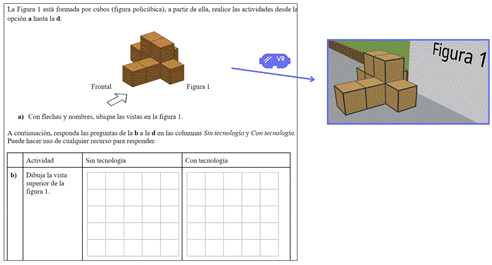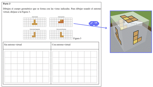 La tarea 2 o Tarea Instrumentada (40 minutos) se realizó en parejas, enfocada en identificar vistas (indicar con flechas sobre la figura, dibujar vistas superior, frontal e izquierda) de dos figuras policúbicas antes y durante el uso de RV (ver ejemplo en Figura 6).