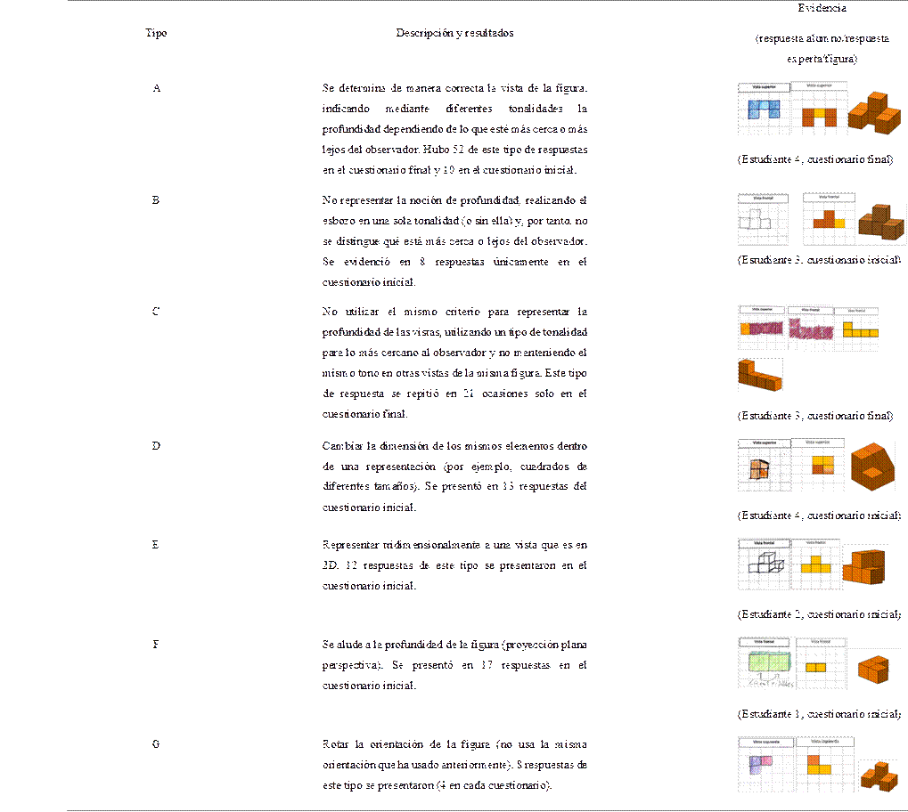 Los tipos de respuestas mostraron el cambio de cada alumno en la visualización de las figuras y cómo a través de la trayectoria de las 3 sesiones cambió la manipulación mental empleada, evidenciando un mayor grado de detalles en las representaciones luego de aplicar una proyección ortogonal.