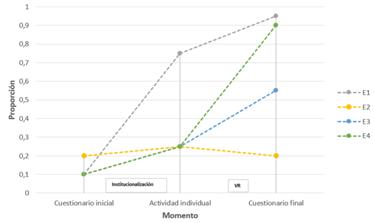La institucionalización del contenido hizo aumentar en respuestas correctas a los estudiantes, aunque luego de la actividad individual, nuevamente volvió a aumentar la cantidad de respuestas tipo A. Sin embargo, el mayor cambio en las respuestas se dio en E4 (ver Figura 13), luego de usar RV. Por el contrario, E2 se mantuvo entre el inicio y el final con la misma proporción, no evidenciando una mejora significativa durante las sesiones.