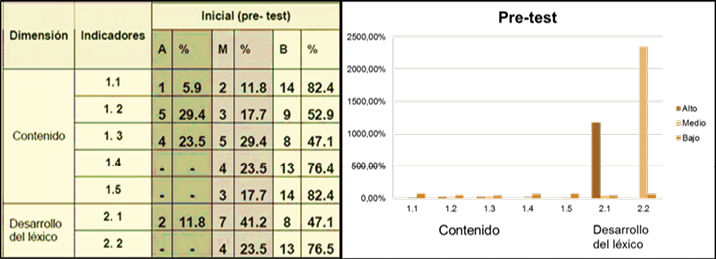 El diagnóstico ejecutado corrobora la problemática preexistente en relación con la producción de textos escritos en los educandos del Octavo grado de la escuela Secundaria Básica “Juan Manuel Feijóo Quesada”, en las tablas se exponen los resultados obtenidos durante la etapa de pre-test: