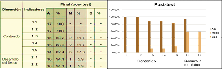 La mayoría de los educandos evidencian dominio del contenido referido al ajuste al tema y a la intención comunicativa, a las características del texto poético, exponen ordenadamente las ideas, así como pueden determinar el juicio de valor y toman posición respecto al juicio de argumentar. Del mismo modo se estima una utilización adecuada de los sinónimos, adjetivos y verbos y el empleo de vocablos y expresiones que más se ajusten a la realidad de lo que se argumenta en el texto (su saber resumido en su conocimiento del mundo). Los resultados fueron mucho más optimistas, pues predominan las evaluaciones de bien y regular, en cada uno de los indicadores muestreados, y se comprueba como asciende el nivel de participación en la construcción del sentido del poema. Por lo que las autoras Llamazares y Alonso-Cortés (2016) lo corroboran al determinar que “son las prácticas pedagógicas sistemáticas de los educadores las que deben garantizar la adquisición de los conocimientos que entran en juego cuando se lee para acceder al sentido de los textos y cuando se escribe para producir textos con sentido” (p. 152).