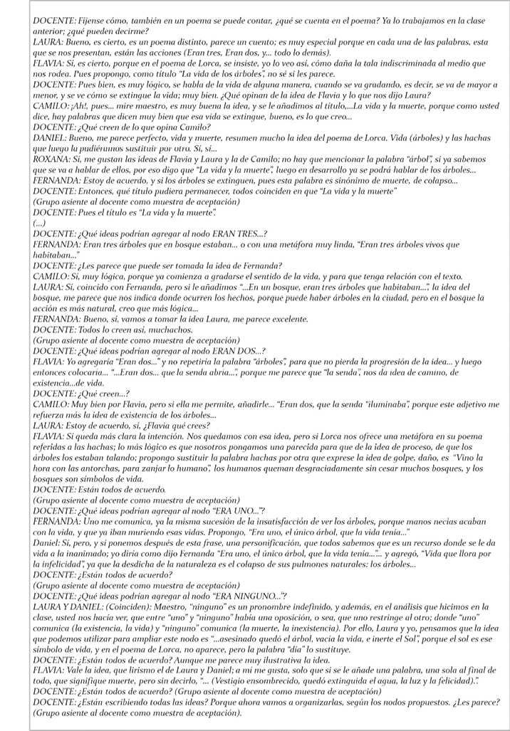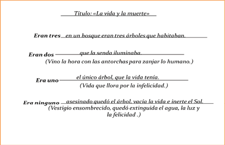 A continuación, se ejemplificará con una práctica pedagógica sistemática con una de sus actividades creativas, a través del poema Cortaron tres árboles, de Federico García Lorca, cómo los alumnos escribieron y leyeron para problematizar y analizar. Veamos un ejemplo, desarrollado en un grupo de Octavo grado a propósito de la producción colectiva de un poema desde un proyecto de escritura, relacionado con la obra de Lorca (carácter de subsistencia y conservación del medio ambiente) antes citada. En aras al espacio del cual se dispone se reproducirán solos fragmentos de la conversación sostenida en el proyecto de escritura a través del intercambio y el razonamiento, porque como expresa Barthes (1974, p. 4) “la inclusión de una visión más ‘variada’ del texto, opuesta a una ‘visión obvia’ es que considera al lector como un ‘productor’ en vez de un ‘consumidor’ de la información que aporta el texto” (p. 4). Y, ello es lo que se pretende, que cada educando sea un “autor”, más que mero ente de “aceptación” del mensaje. Puede verse como, en tanto el escribir permite reflexionar sobre el propio pensamiento, objetivar las ideas, así como transformar el conocimiento, es para Miras (2000) desde la perspectiva de su uso, cumple una doble función: la comunicativa y la representativa. La composición de textos permite representar, crear o recrear los objetos de nuestro pensamiento. Se coincide con Cavalli (2011) que cuando se educa la reflexividad se ofrece espacios al educando para resolver y pensar, que no es más que prepararlos para construir su cosmovisión del mundo.