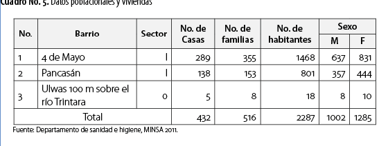 Los resultados reflejan que existen un total de 432 viviendas, con 516 familias y 2,287 habitantes en una franja de 100 metros paralelos al río Trintara (información de los tres barrios y comunidad de ulwas). Sin embargo, gran parte de la disposición de las viviendas en el terreno es desordenada y esto implica mayor vulnerabilidad.
