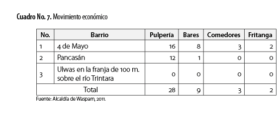 El cuadro refleja que los barrios 4 de Mayo y Pancasán tienen una vida económica dinámica, ya que existe un alto número de pulperías (16 y 12 pulperías respectivamente). En segundo plano les siguen los bares, comedores y fritangas. Esto demuestra que existe una vida activa que se deriva del sector informal y que no se encuentran registrados en la municipalidad. Esto hace que las actividades se desarrollen dispersas en la cuenca, provocando mayor daño ambiental.