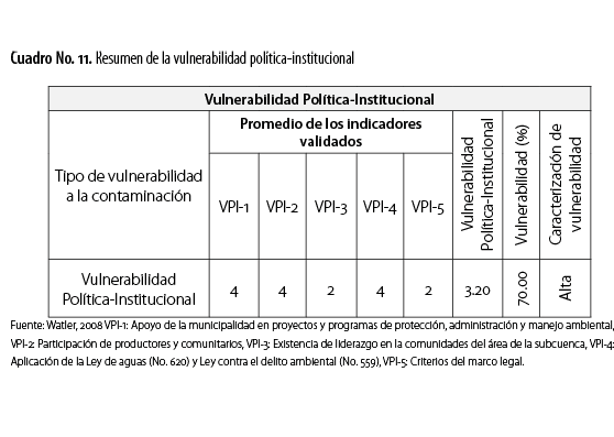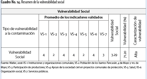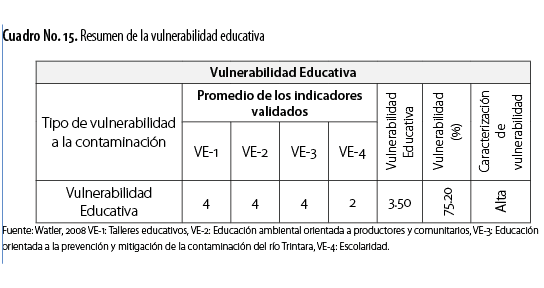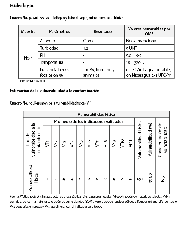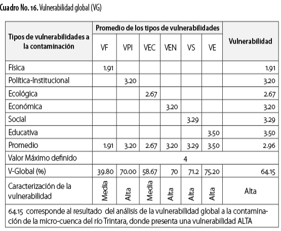 Los resultados muestran que la vulnerabilidad global a la contaminación de la micro-cuenca del río Trintara es de 2.98 (61.78 %), caracterizándose con una alta vulnerabilidad a la contaminación. La vulnerabilidad social, educativa, política-institucional y económica, están en el rango de alta vulnerabilidad con un valor superior a tres, todas tienen que ver con acciones directas de la población. En cambio, la vulnerabilidad física y ecológica presenta una valoración de vulnerabilidad media, con un valor inferior a tres. Se recomienda la aplicación de medidas de ordenación de la micro cuenca de manera institucionalizada con el acompañamiento de las comunidades.