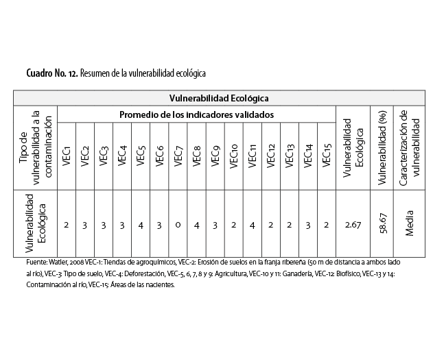 Luego se estimará la vulnerabilidad global a la contaminación utilizando la siguiente ecuación: VG = ∑i6=1 xi* wi= (VF*0,25 + VPI* 0,10 + VEC* 0,25 + VEN* 0,15 + VS* 0,15 +VE* 0,10)