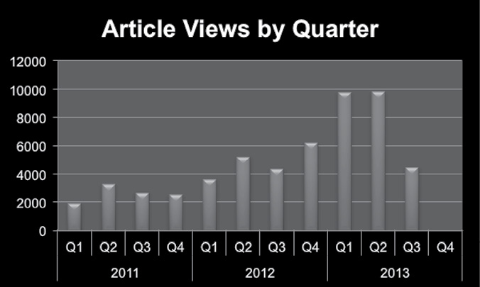 Figura No. 2. Número de visitas por trimestre de la Revista Ciencia e Interculturalidad en Latin American Jornal online (LAMJOL), período marzo de 2011 a octubre de 2013 (Sioux Cumming, 2013).
