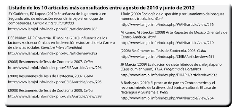 A finales de junio de 2012, Latin American Jornal Online publicó su primer boletín informativo, en él se destaca que se contaba con 50 números y 385 artículos. Todos ellos estaban disponibles en su versión con texto íntegro. El número total de visitas a los artículos de agosto de 2010 a junio de 2012, fue de 44.344 artículos. La revista con mayor número de consultas fue Ceiba, con 7.811; le siguió Encuentro, con 6.774, y Ciencia e Interculturalidad, con 5.079. El número de consultas de artículos de una revista especializada se ve influenciado por el número de artículos que están disponibles en el sitio web. Algunas revistas tienen muchos más artículos que otras, lo que explica que estas revistas tengan un número mayor de consultas de artículos. En el cuadro siguiente se presenta la lista de los 10 artículos más consultados, entre ellos se encuentran dos de Ciencia e Interculturalidad (INASP, 2012).