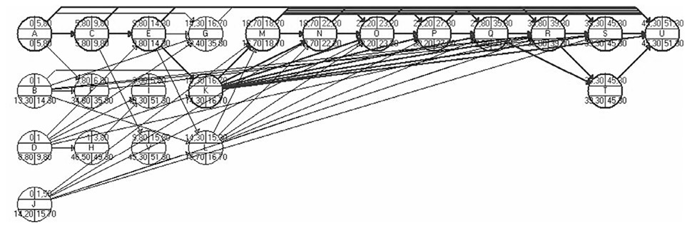 Por ejemplo en la columna 2 se muestra la ruta crítica formada por las actividades A,C,E,K,M,N,O,P,Q,R,S y U, indicando una secuencia de tareas críticas para el proyecto, que conecta el principio y el final del mismo.