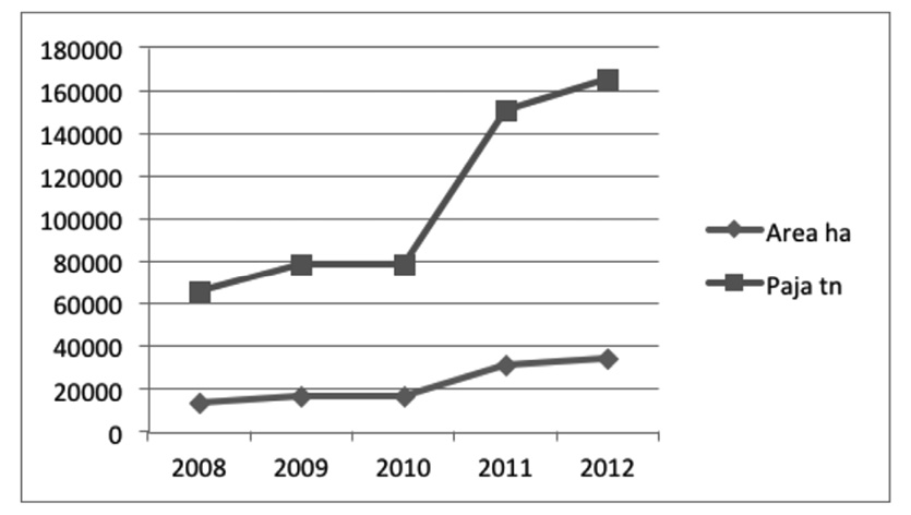 Utilizando el índice antes mencionado se pudo calcular la cantidad aproximada de paja de arroz producida por la entidad en cinco años a partir de 2008 hasta el 2012. La cual se muestra en el siguiente gráfico: