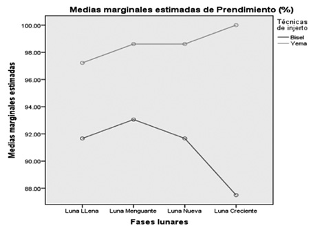 No existe evidencia significativa para la interacción fases lunares* técnicas de injertos, (p=0.761 > 0.05), siendo en luna creciente factible para obtener el mayor prendimiento en la técnica tipo yema (100%), mientras que la luna menguante propicia el mejor prendimiento en el injerto tipo bisel (93.057%).