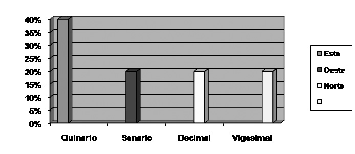 Vigesimal: “Los mayas idearon un sistema de base 20 con el 5 cómo base auxiliar. La unidad se representaba por un punto. Dos, tres, y cuatro puntos servían para 2, 3 y 4. El 5 era una raya horizontal, a la que se añadían los puntos necesarios para representar 6, 7, 8 y 9. Para el 10 se usaban dos rayas, y de la misma forma se continúa hasta el 20, con cuatro rayas” (http://.www.es.wikipedia.org/wiki/sistema-numeracion).
