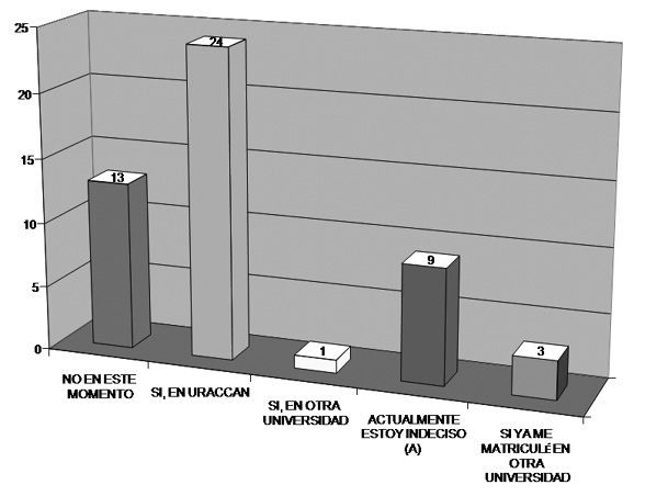 Sobre los planes que tienen los estudiantes que abandonaron la carrera (gráfico No. 4) subjetivamente el 56 por ciento pretende continuar sus estudios universitarios, de ellos un 6 por ciento está matriculado en otra universidad, un 2 por ciento tiene planes de estudiar en otra universidad y el 48 por ciento pretende regresar a URACCAN y finalmente el 44 por ciento restante está indeciso o no tiene proyecto inmediato para estudiar. Estos resultados indican que aproximadamente un 50 por ciento de los que dejaron la carrera pretenden reingresar a URACCAN a continuar sus estudios pudiendo optar por una nueva carrera, lo que indica que hay confianza en esta casa de estudios superiores.