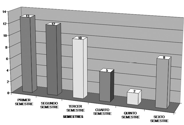 El gráfico No. 1, representa la consulta realizada en el semestre que los estudiantes abandonaron la carrera y en la cual se constata que el 80 por ciento (40 estudiantes) se alejaron de la vida universitaria en los primeros dos años de estudio y el mayor índice de deserción se da en el primer año de la carrera, (50 %) por lo tanto, la atención para lograr mayor retención se debe orientar hacia los dos primeros semestres.