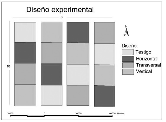 Tomamos en cuenta la dirección orientada de las parcelas de norte a sur para que permitiera mayor captación de la radiación solar que requiere este cultivo. El experimento lo realizamos en Bloques Completamente al Azar (DBCA), la naturaleza lo cataloga como un arreglo unifactorial con cuatro tratamientos y 4 repeticiones. Cada bloque o parcela experimental tuvo una población de 60 semillas de cocos, Alto del Atlántico, la cual tiene una dimensión de 10 metros de largo x 8 metros de ancho, dejando 0.5 m de área de borde perimetral y 0.5 m entre bloque de los bancales, se implementó el método al azar con 1 repetición de los tres cortes y el testigo con 15 nueces y 240 el universo.