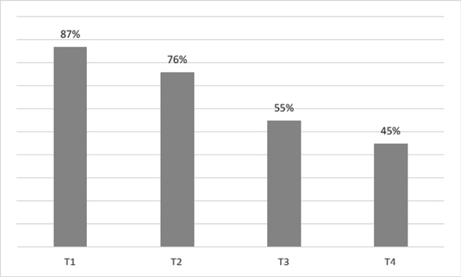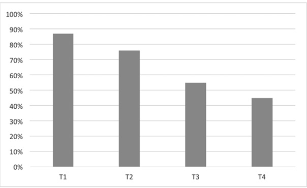 En la figura 4, podemos observar el índice de la mortalidad que los diferentes tratamientos evaluadas en el coco nucífera, en donde se determinó que el T4 (vertical) presentó 5% de mortalidad (de los 60 nueces de cocos), T3 (transversal) con 17% (60 nueces cocos), T2 con 25% de mortalidad (60 cocos), en último T1 con 53%, esto quiere decir que el corte vertical es el que presentó el índice de mortalidad mínima, seguido con corte transversal y corte horizontal, similares valores determinamos a los 135 días, en general de la población de 240 cocos, experimentado que 183 individuos germinaron y 57 nueces no alcanzaron el proceso germinativo.