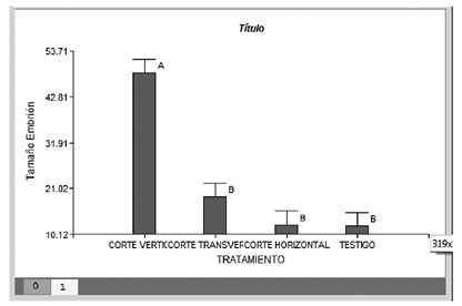 • Tamaño del embrión. El tamaño del embrión, medimos con cinta milimétrica en la visita de la unidad experimental en los períodos 60, 75, 90, 105 y 135 días de establecido con el objetivo de comprobar con cuál de los tres tratamientos presento mejores características del embrión.