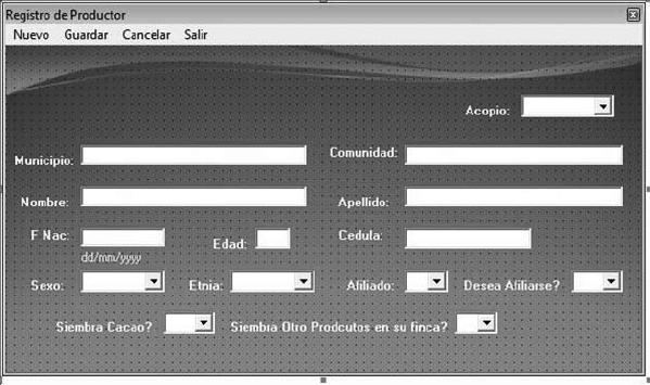 Figura 9. Formulario de registro de productor. Sistema Unión Cristiana de Productores (UNCRISPROCA)