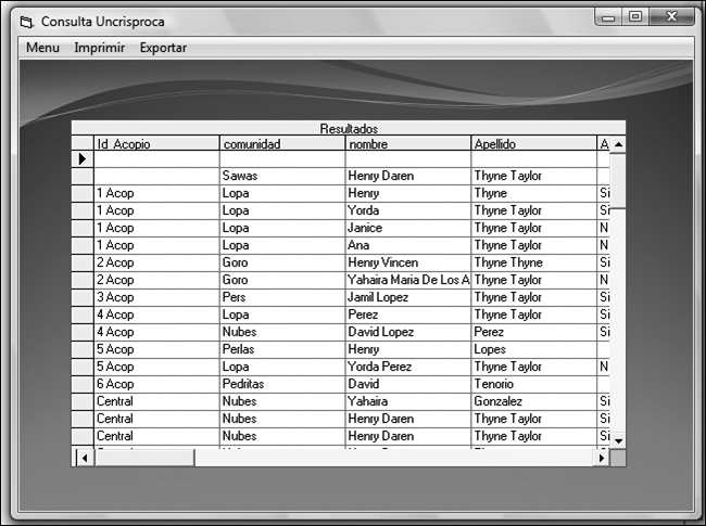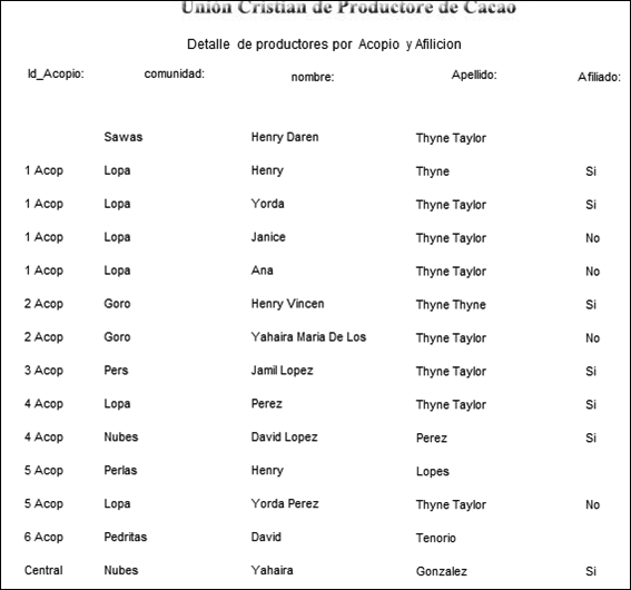 Figura 11. Informe preliminar Consulta de productores registrados por comunidad. Sistema Unión Cristiana de Productores de Cacao (UNCRISPROCA).
